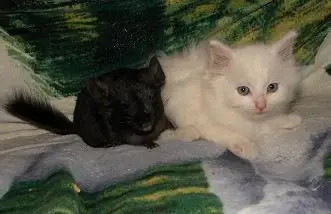 Mám doma ještě psa, kočky, papoušíky a akvarijní rybky, ale ti nejsou na chov. Snažím se, aby pejsek a kočičky byli na hlodavce a ptáky zvyklí a neublížili jim, ale musí se počítat s tím, že psi a kočky byli chováni na zabíjení hlodavců a tak pokud máte doma například teriéra nebo obyčejnou kočku domácí, je potřeba počítat s tím, že může zvířátku ublížit. My proto máme zvířata při venčení po bytě stále pod dohledem a všechny hlodavce v uzavřených bezpečných ubikacích kam za nimi ostatní zvířata nemohou. Na této fotce vidíte, že jsme je učili už od malička.