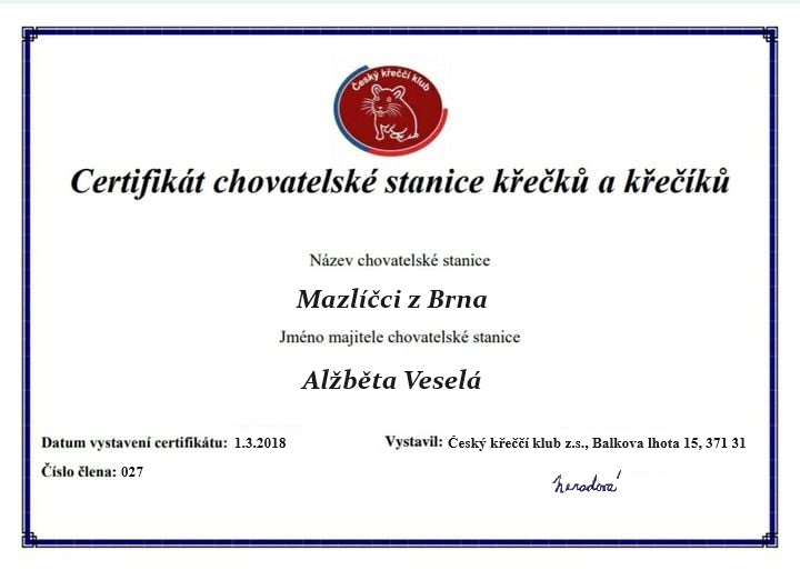 Moje certifikáty chovatelské stanice:
