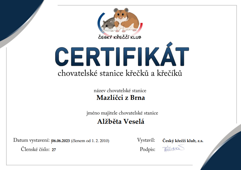 Prvního křečka v chovu či díky mému přispění založili CHS tyto chovatelské stanice:
