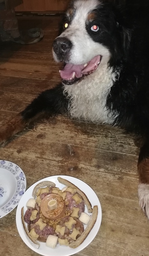 Když jsem adoptovala mého salašníka, bylo mu 9 měsíců a byl zvyklý krást si jídlo ze stolu. My mu museli ukázat, že jídlo patří nám a on se ho může dotknout pouze pokud mu to dovolíme. Pkládali jsme jído na talíři na zem a když ho chtěl sníst, tak jsme mu řekli nahlas a důrazně nesmíš a rychlým pohybem ruky se ho silněji dotkli prsty lopatky nebo boku. Několikrát dokud zůstal stát a jen na jídlo koukal. My stále stáli nad jídlem a čekali. Po chvíli to vzdal a buď si vedle jídla lehnul nebo popošel. Za to dostal odměnu. Takto jsme to trénovali dokud nepřestal mít o jídlo na talíři zájem a my jej tak mohli nechat na stole i delší dobu.